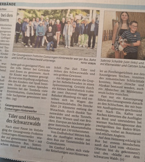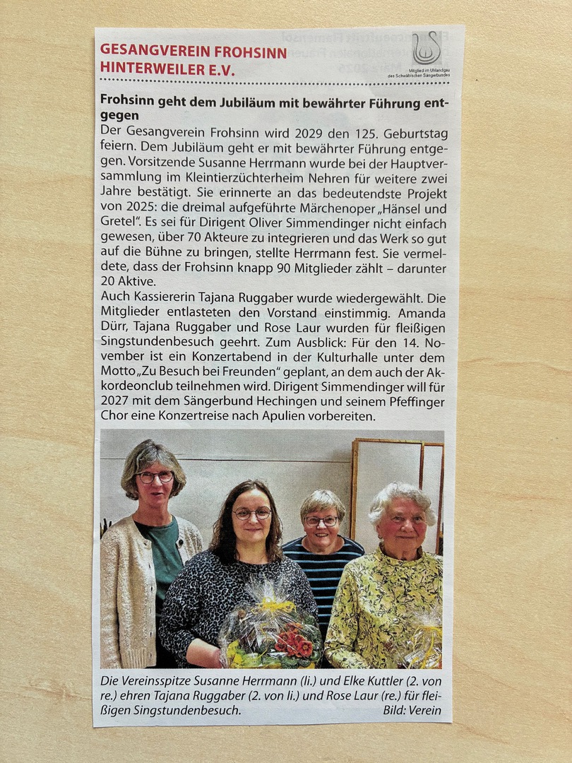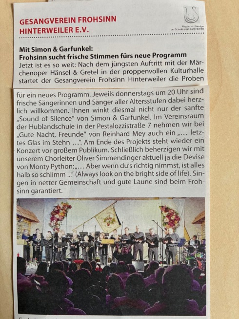 Der eingeladene Gesangverein „Frohsinn“ Gomaringen-Hinterweiler e.V. geleitet von Oliver Simmendinger, brachte bekannte Lieder mit: „I’m gonna sing“, den „Irischen Reisesegen“, ein Musical-Hit „I will follow him“ aus Sister Act und "Was ich mir wünsche". Diese ausgewählten Darbietungen wurden vom Chor schwungvoll vorgetragen und mit viel Herz gesungen.